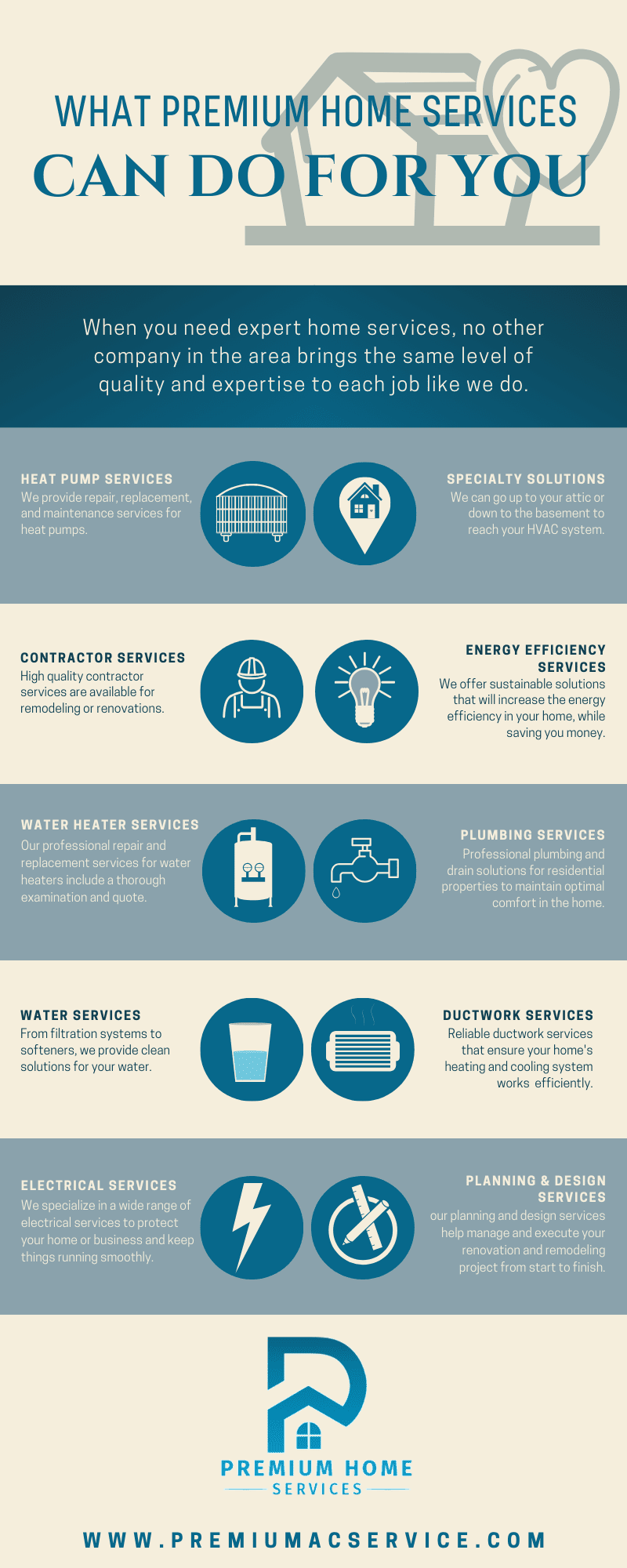 When your family needs contractors you can trust to provide plumbing, electrical, or HVAC services — whether that be installations , inspections , maintenance , repairs , or replacements — Premium Home Services is the company you should call. If you are looking for service technicians who will arrive hours late, track dirt throughout your home, and apply minimal effort to fixing your problem, Premium Home Services is not who you should call. Our licensed contractors aren’t just the best in their respective fields — they’re also the most polite and respectful contractors around. Review the infographic below for a full list of our services, and then continue reading as we dive into the factors that make us number one in the area: